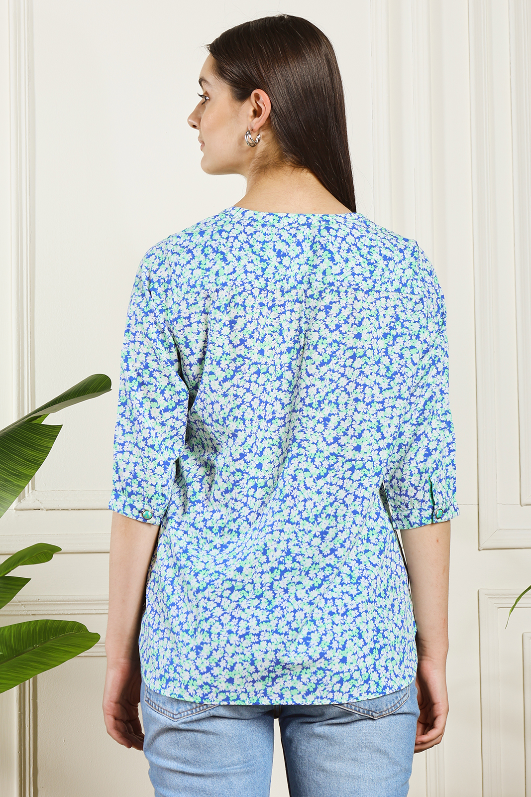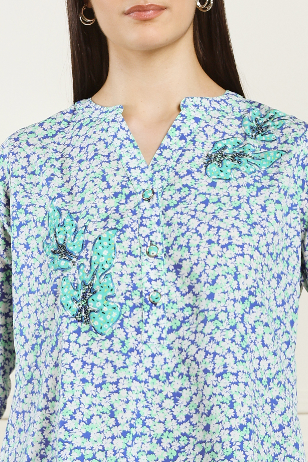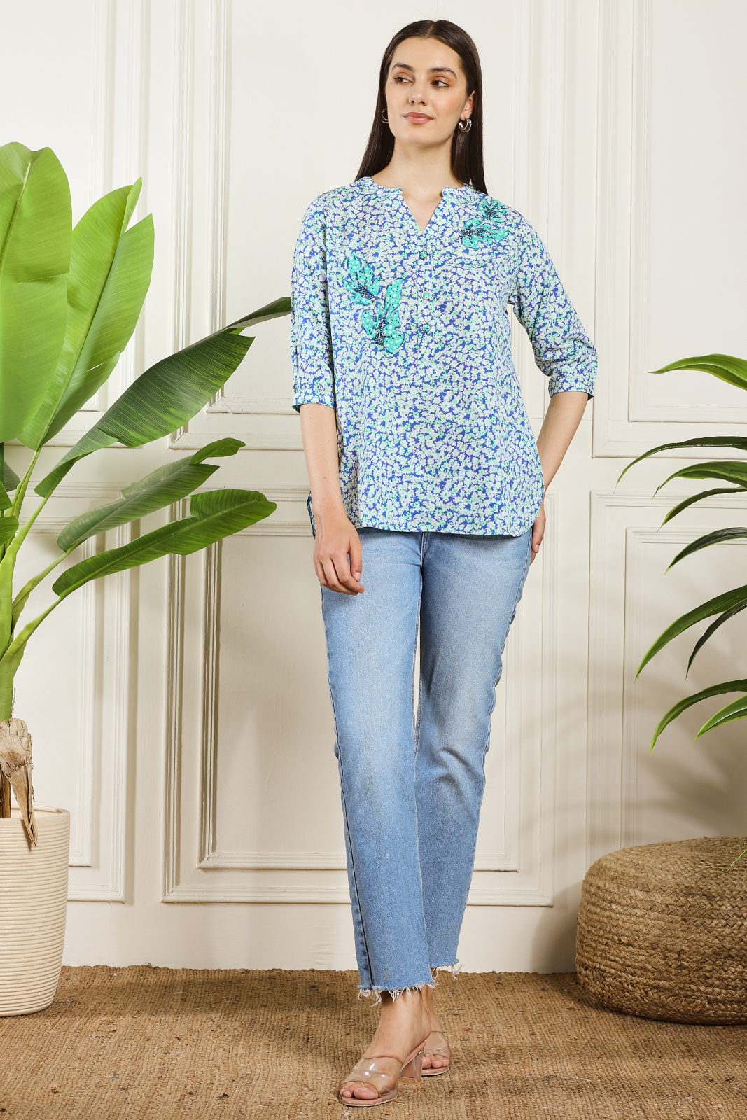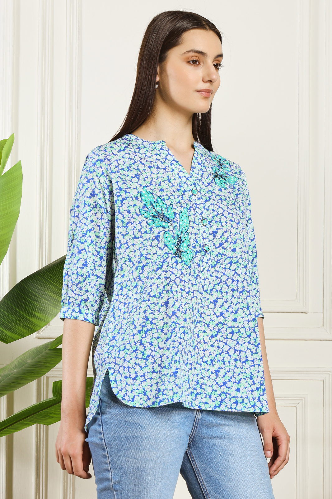 Polyester crape printed top with contrasting collar and cuff . featuring front button up , three-fourth sleeves and Embroidery and embellishment in the front. Perfect for the summers.