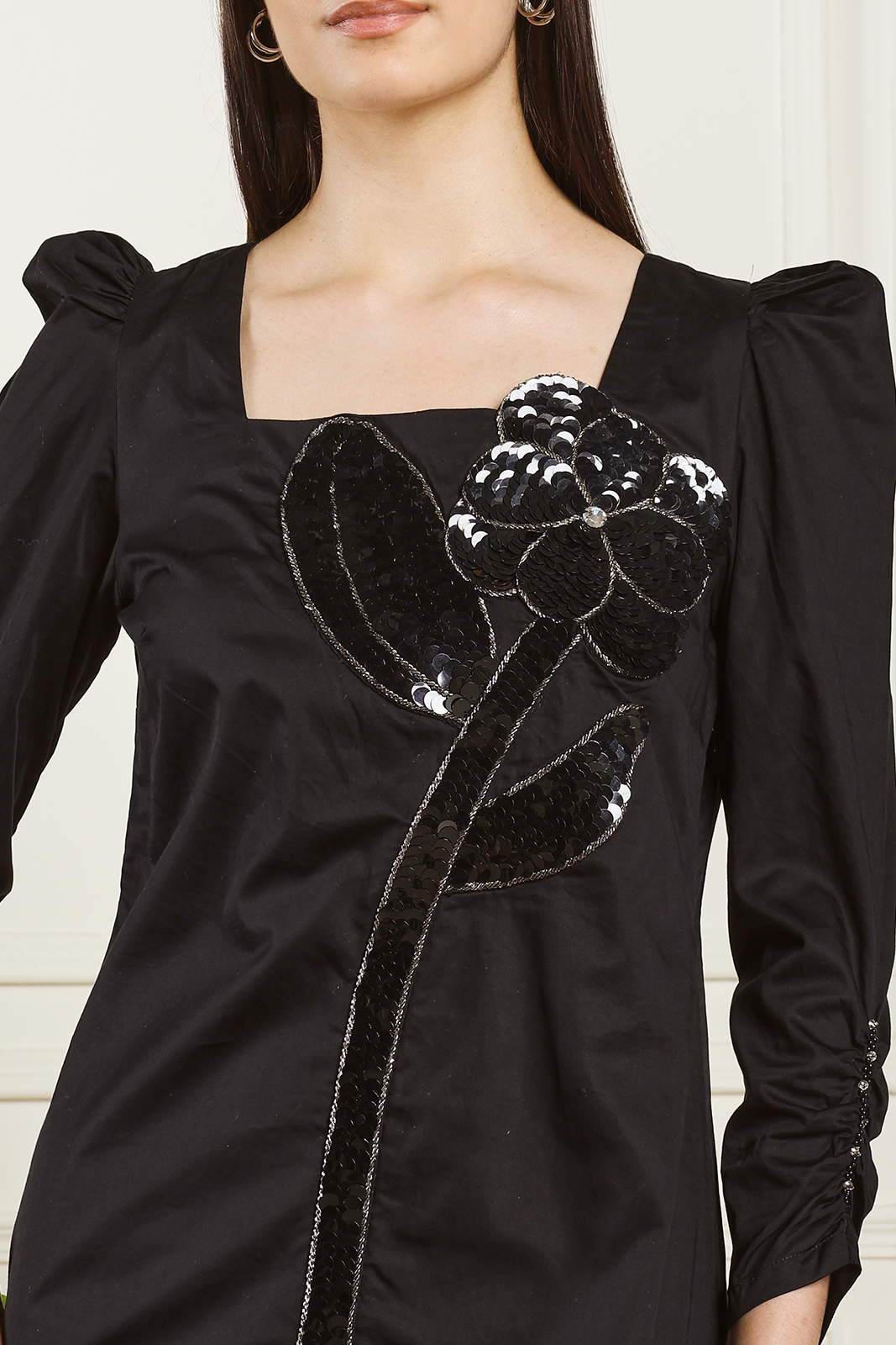 Cotton Satin Little Black Dress . Featuring Embellished sequence flower in front . Elasticated full sleeves .