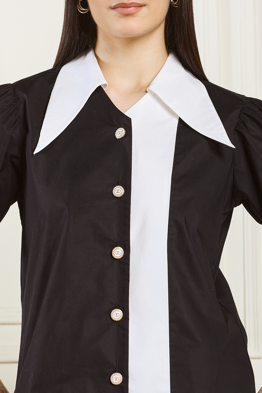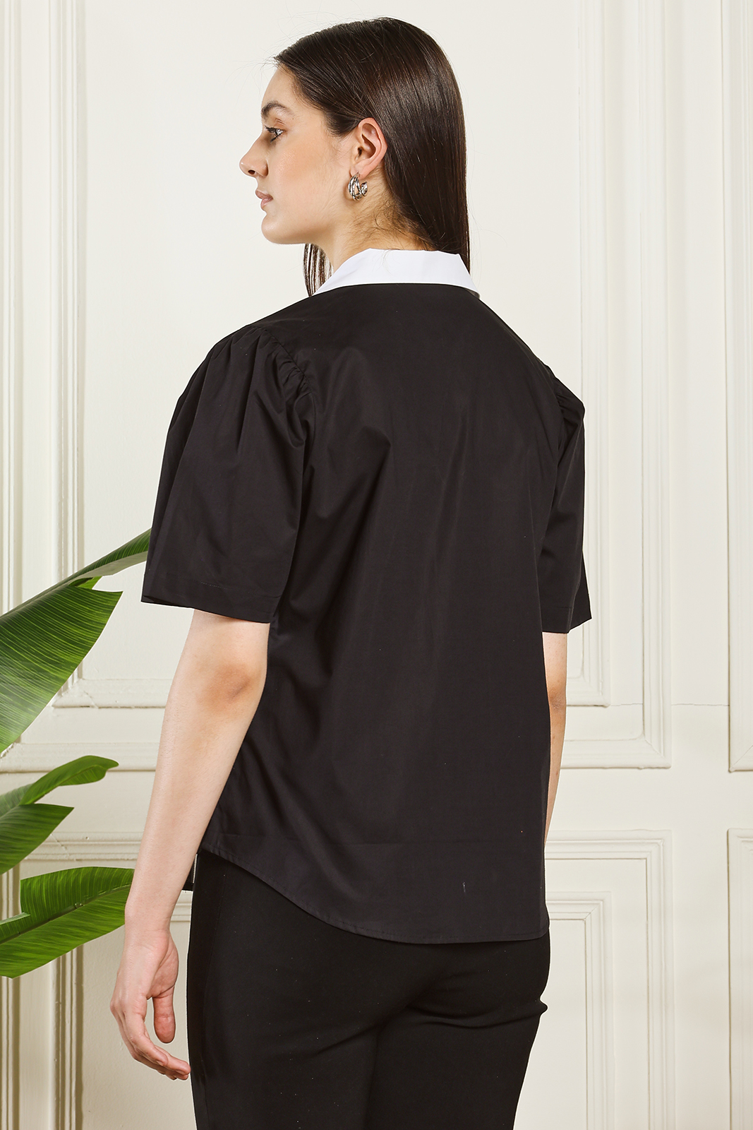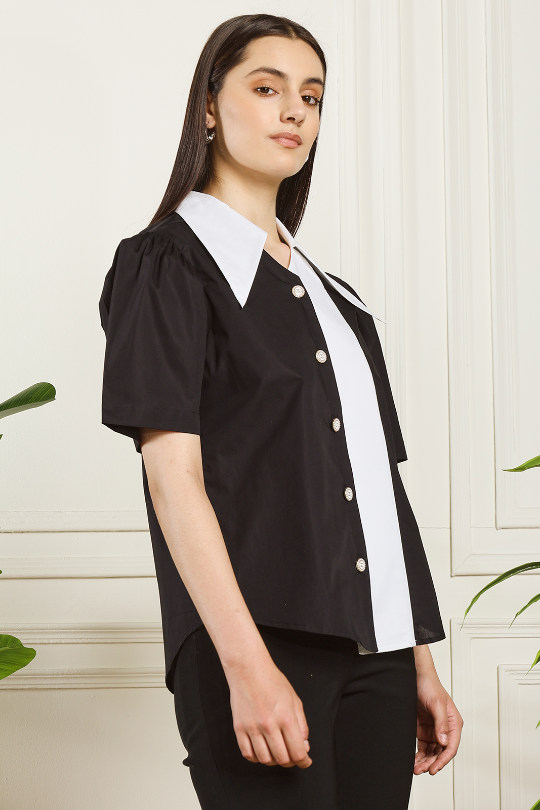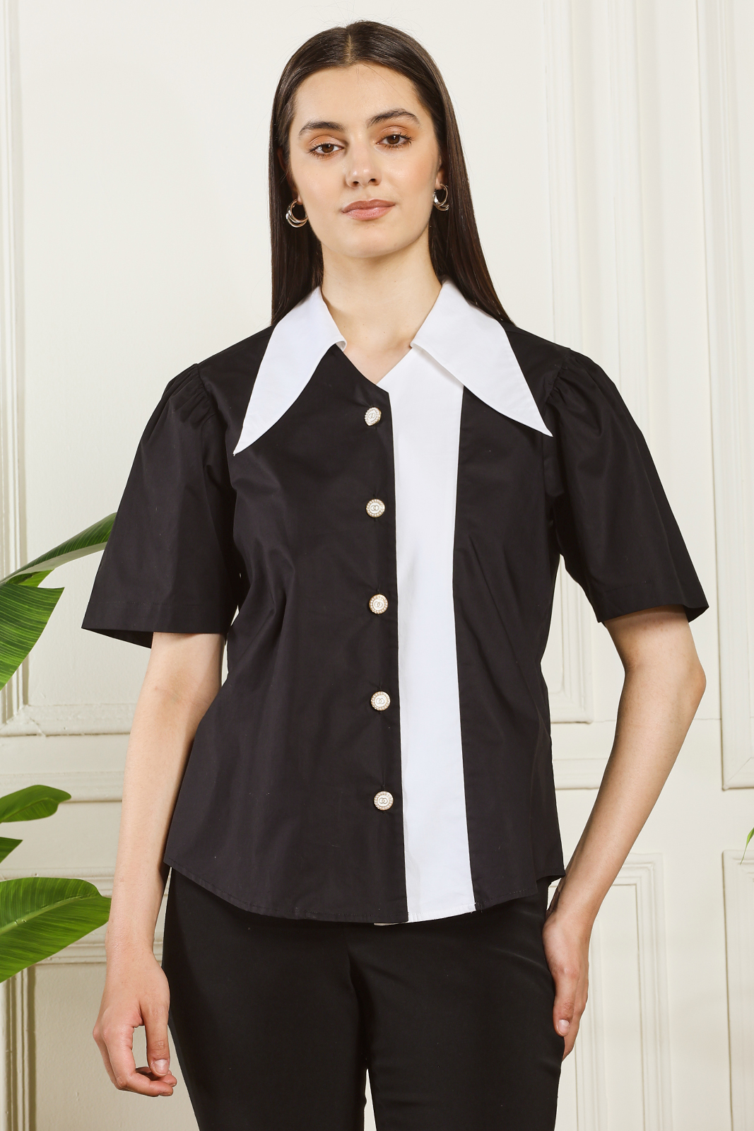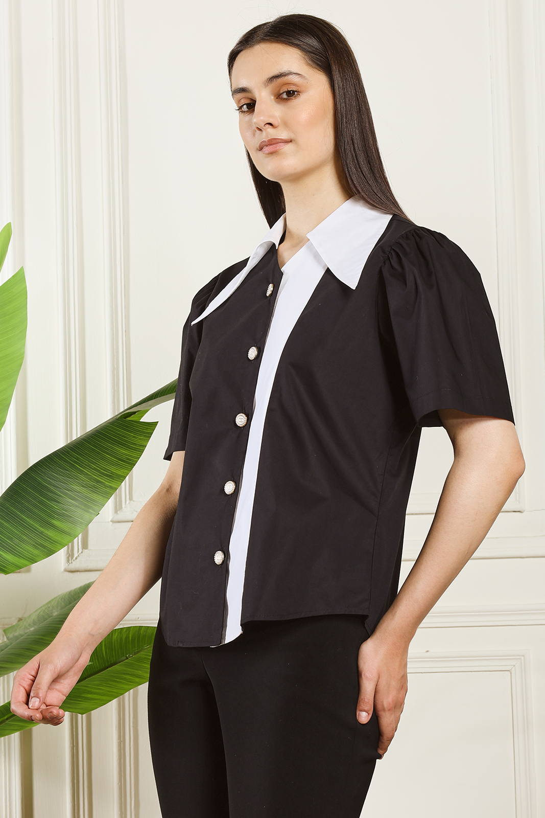 A stylish black and white shirt designed with a striking oversized collar and contrast detailing. Made from premium breathable fabric, this piece adds elegance and boldness to any outfit—perfect for work, casual outings, and modern everyday wear.