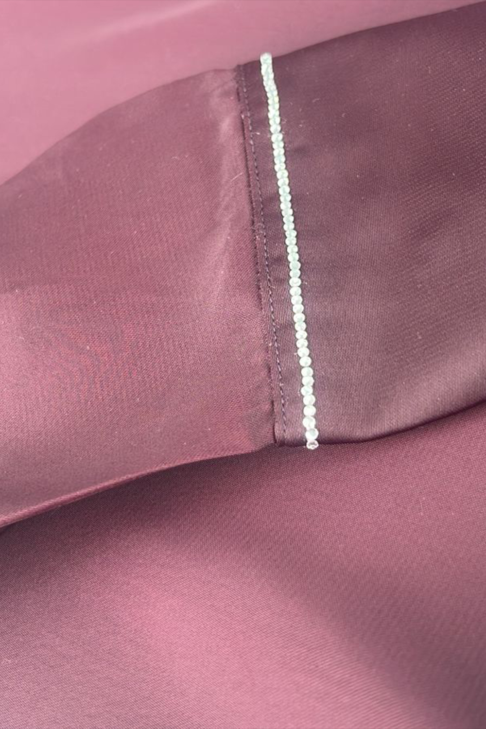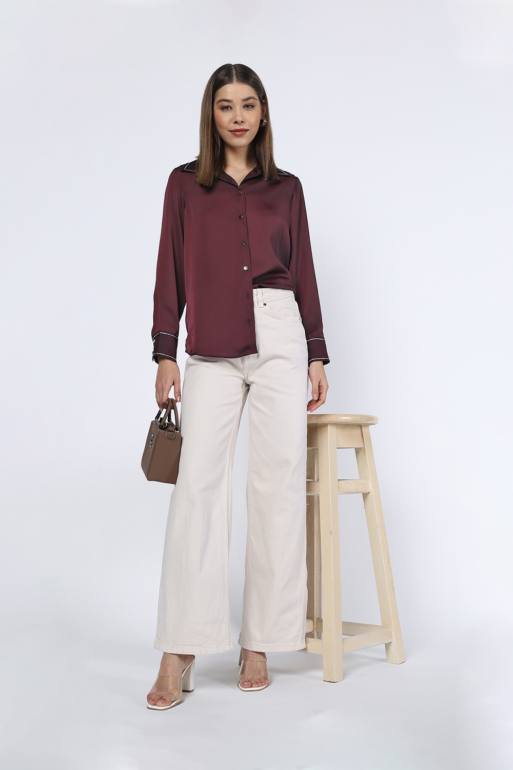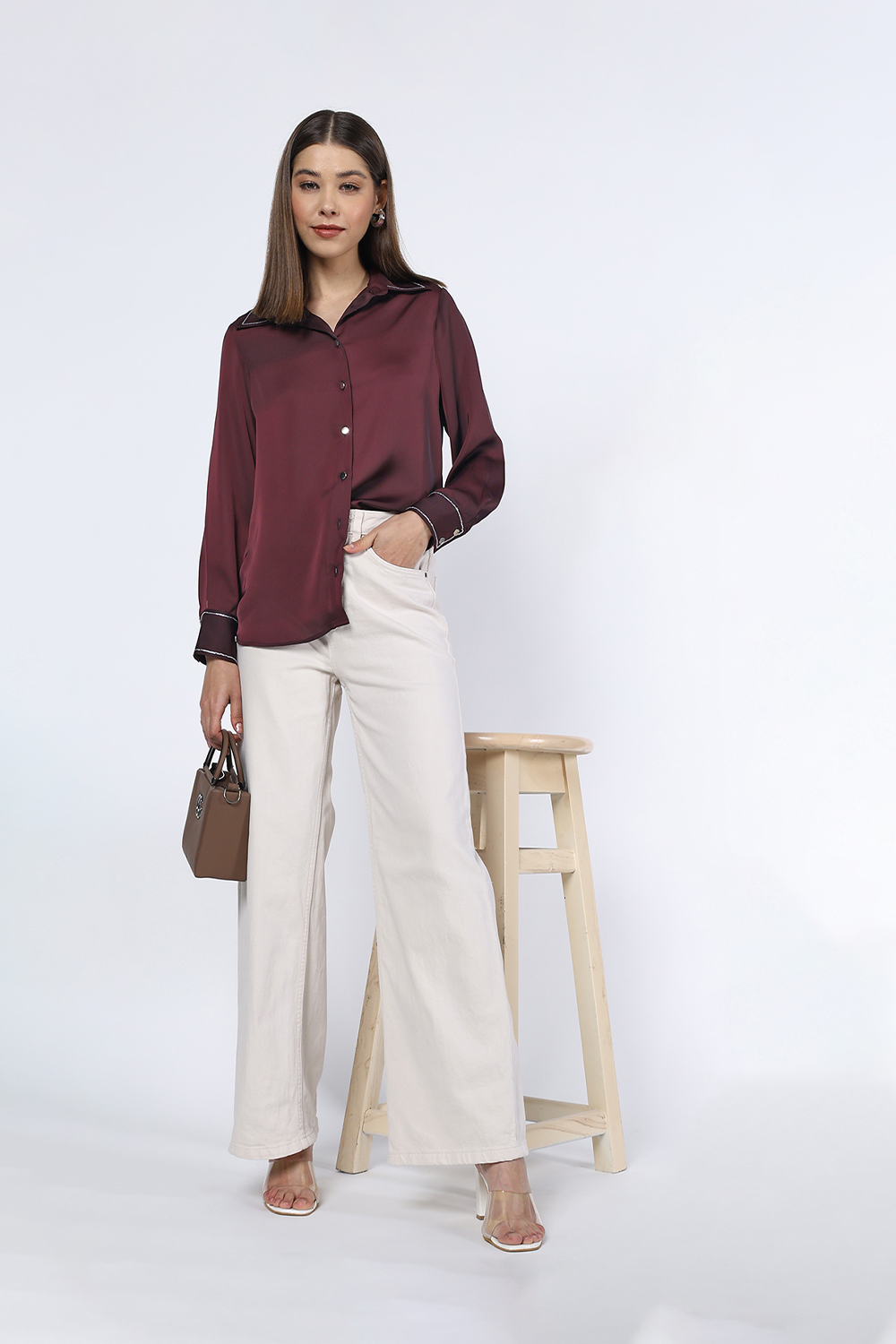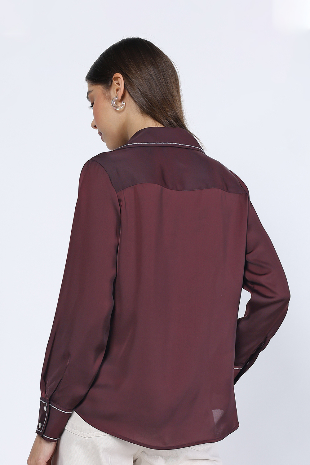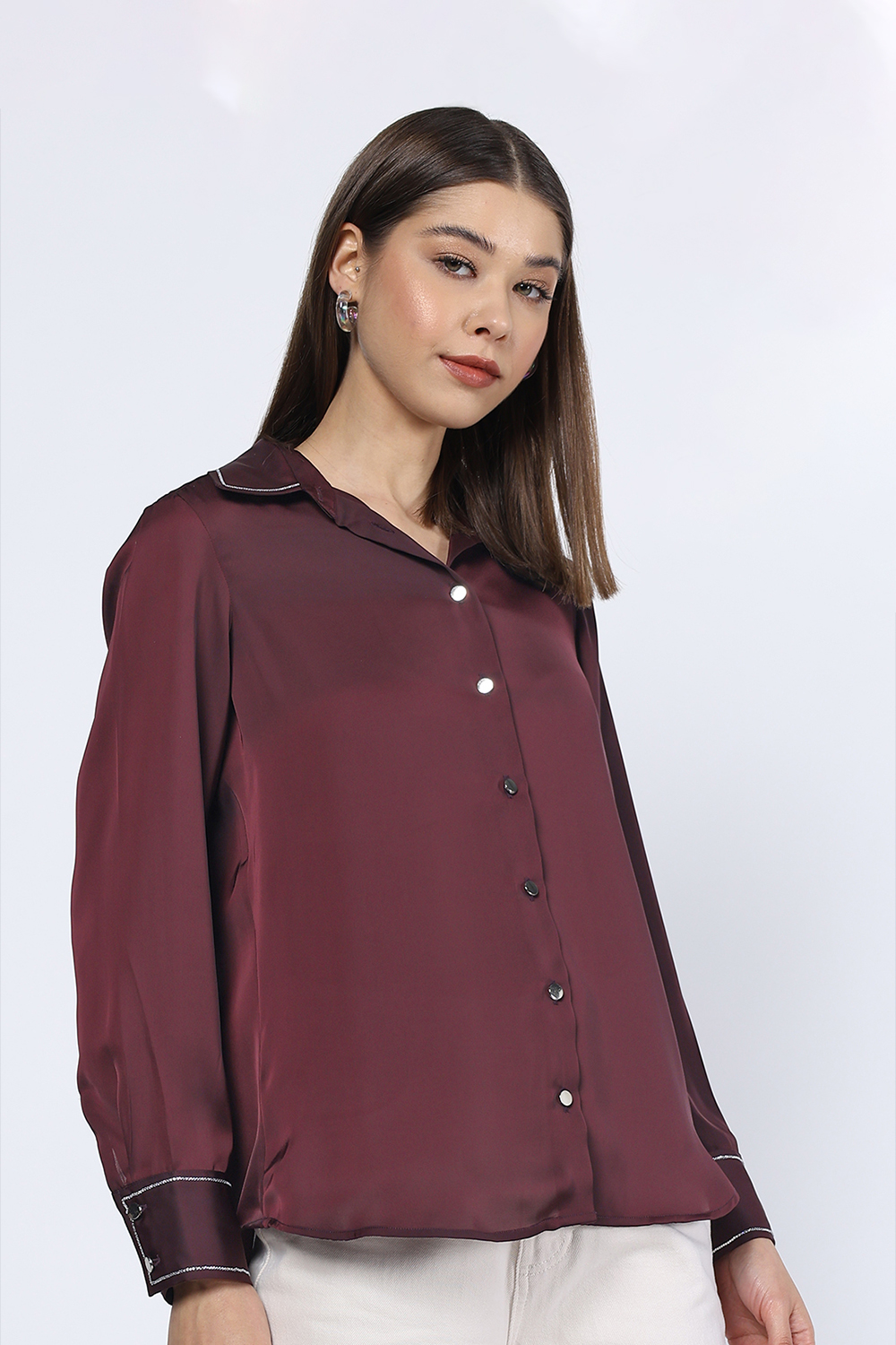 Flowing Collared Shirt . Featuring Long Sleeves with Cuffs , Button up Front and Rhinestone Embellishment Collar and Cuffs .