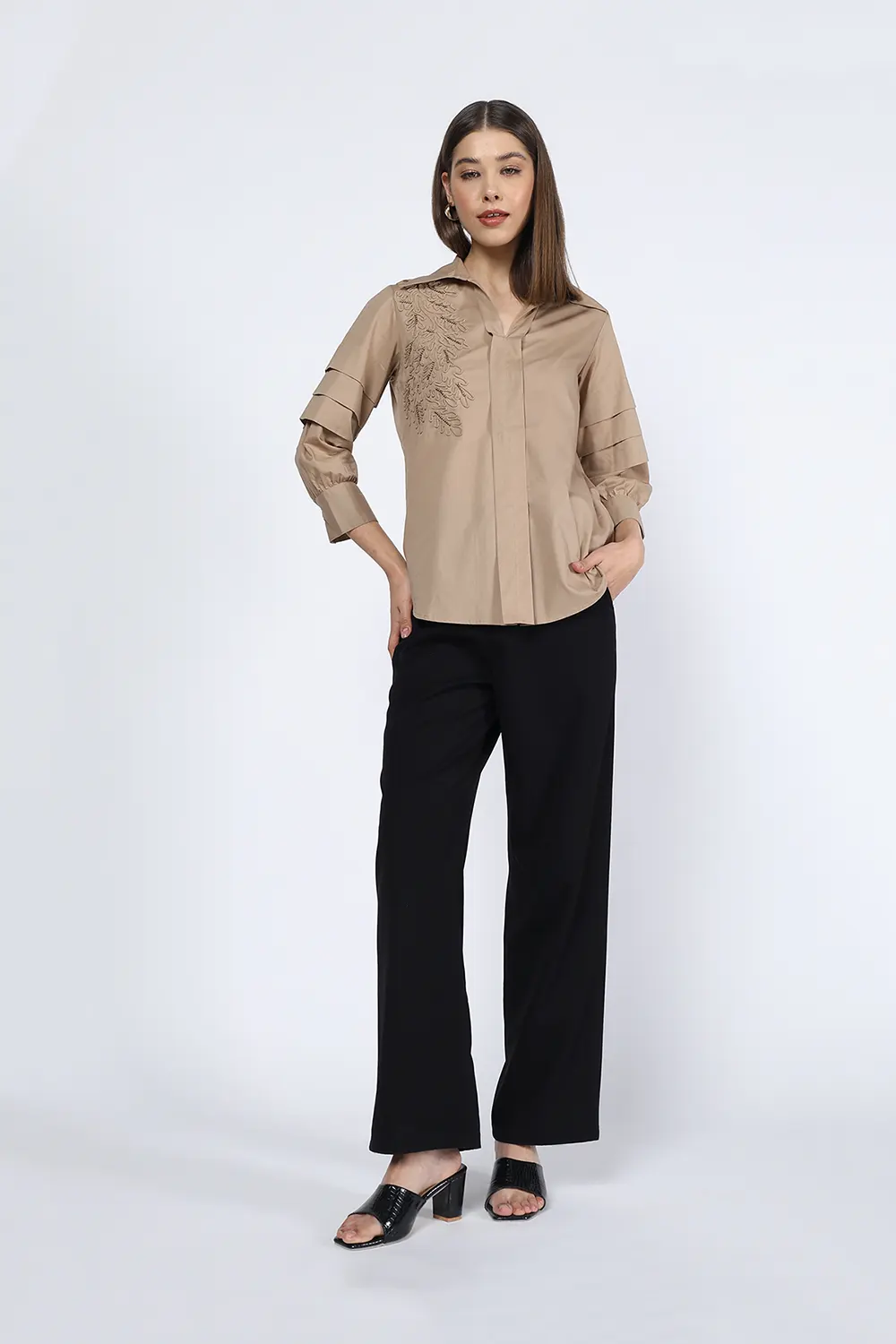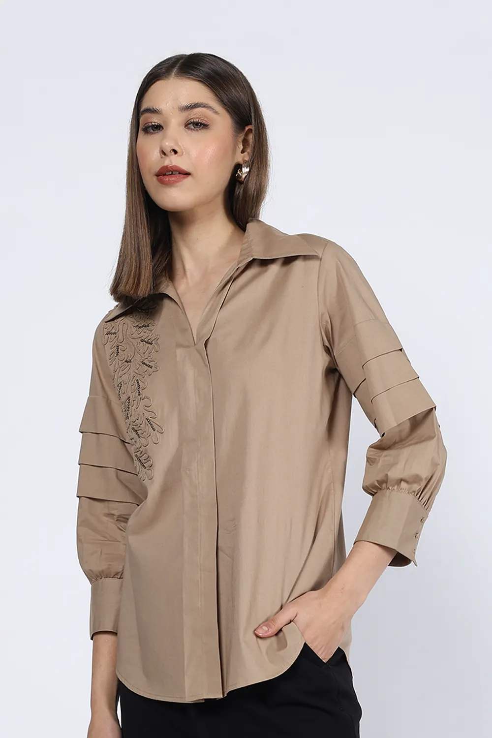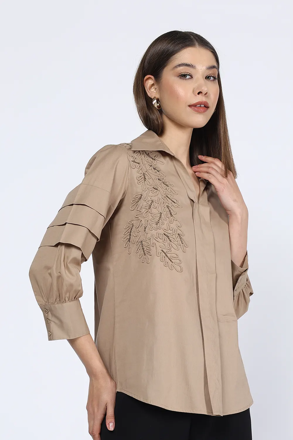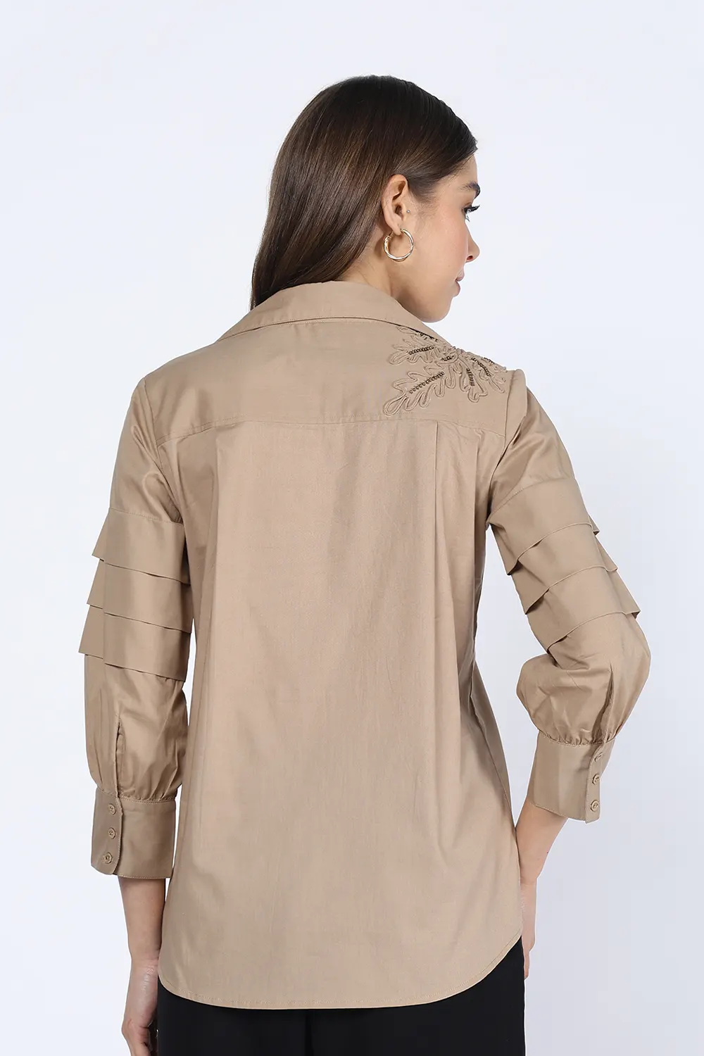 BEIGE PLEATED SLEEVE EMBELLISHED SHIRT quantity